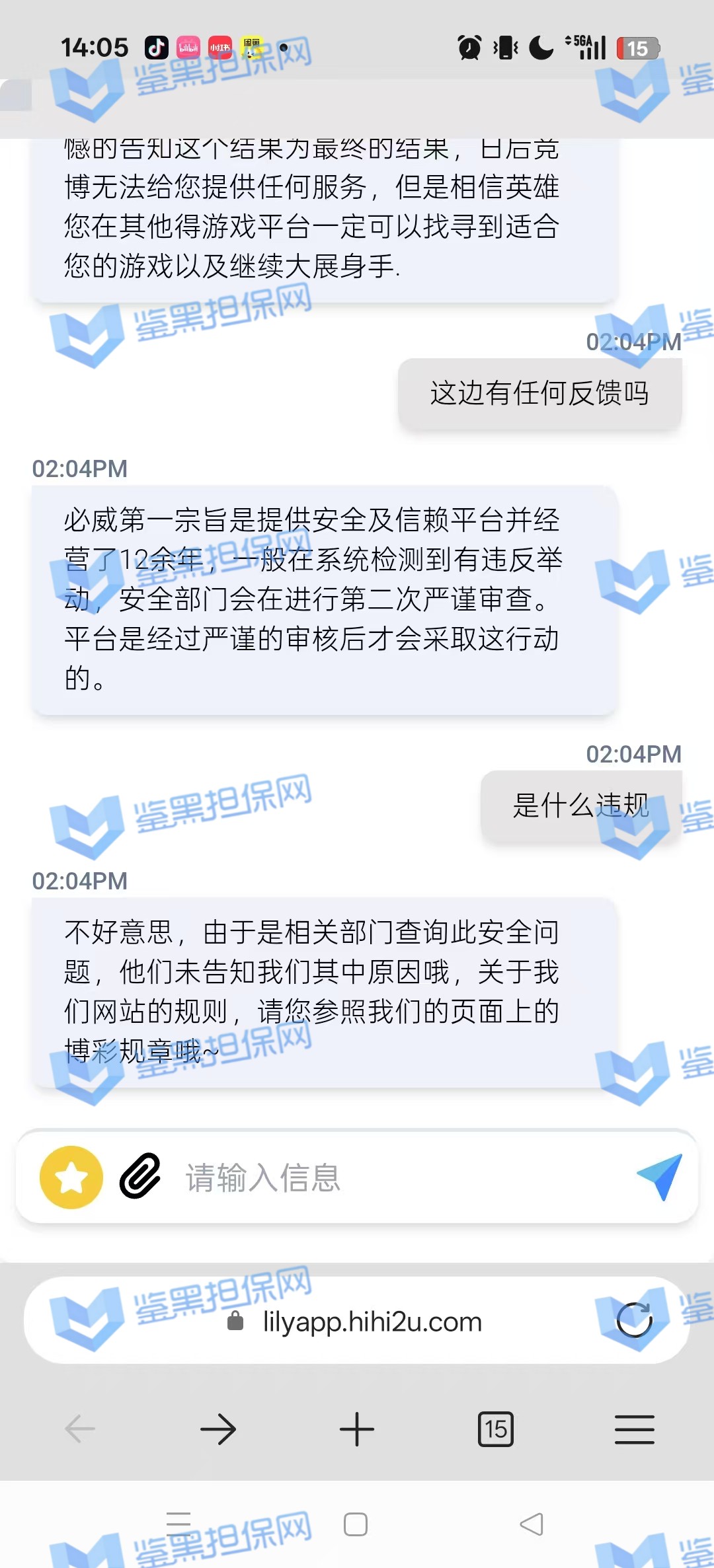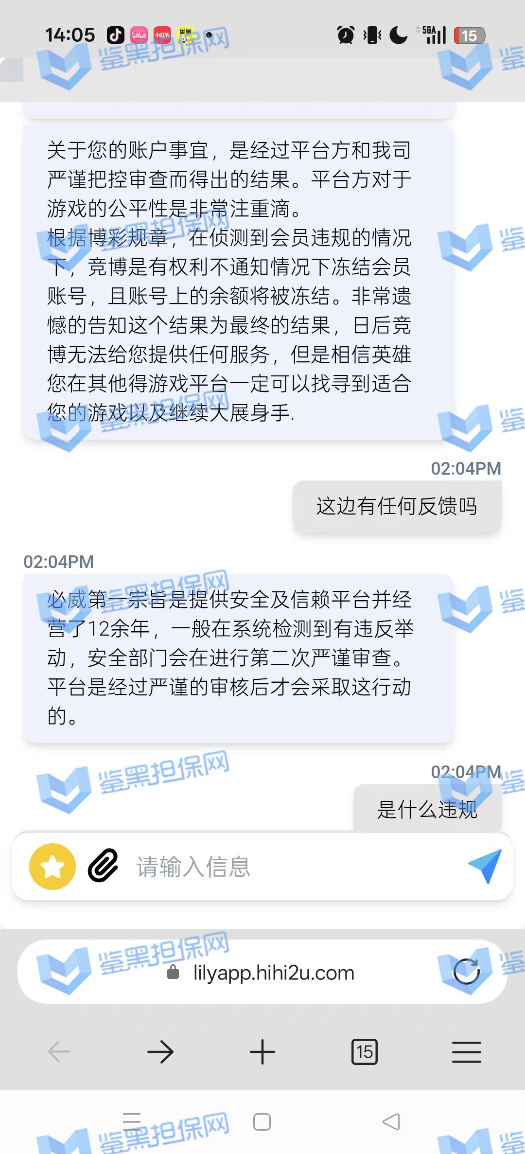 3、鉴黑担保网通过不同渠道与该平台相关负责人取得联系,关于这个会员的情况进行交涉,对方表示是风控部门检测到该会员的异常投注,扣除所有非法获利金额,按照游戏条例可在不通知的情况下进行冻结账号,维权专员让提供官方违规游戏进行复查核实,对方无法提供且拒绝更多交涉,本金也不愿意退回,可见是该会员盈利金额较多,平台找“借口”进行黑款,行为极其恶劣!!!