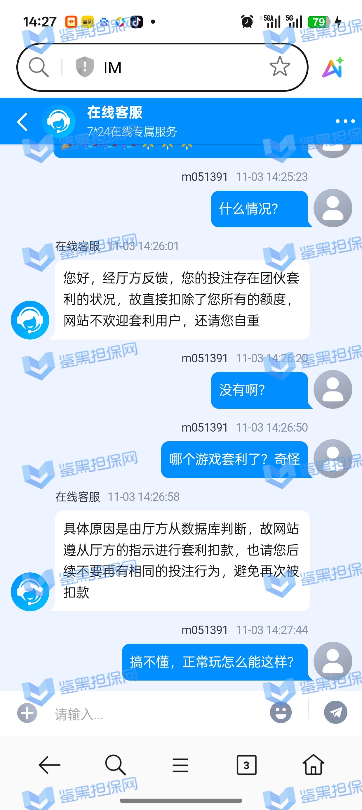 2、鉴黑担保网维权专员联系该平台相关负责人核实情况,对方表示该会员在体育游戏里面存在团伙套利的情况,关联投注等非正常行为,维权专员要求提供相关厅方反馈进行复查,对方拒绝提供,一味的说辞不加以证明,直接扣除本金以及盈利,存在黑款的行为!!